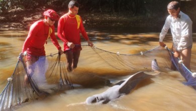 Corpo de Bombeiros Militar em Aruanã resgata boto preso em um poço no Ribeirão do Roncador