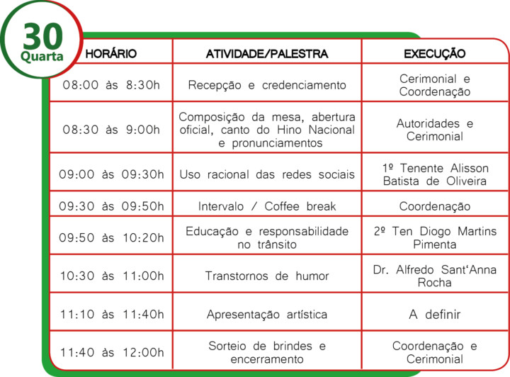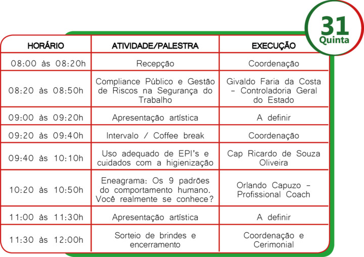 O CBMGO realizará nos dias 30 e 31 de outubro das 8h às 12h a 11ª edição da Semana Interna de Prevenção de Acidentes do Trabalho (SIPAT). Este ano o evento será realizado no auditório da Secretaria de Segurança Pública na Avenida Anhanguera 7364 Setor Aeroviário, Goiânia.
