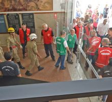 Bombeiros Militares realizaram suporte aos 40 brigadistas do SESMT da Assembleia Legislativa organizando a retirada de vítimas e atendimento pré-hospitalar durante o simulado. Concluído a retirada das pessoas da edificação, foi realizado um debriefing (revisão e reflexão pós-ação) com a equipe do SESMT e também foram feitas orientações diversas aos envolvidos, por parte do CBMGO. Participaram do Simulado as equipes de salvamento e resgate do 1º Batalhão Bombeiro Militar. Confira fotos: