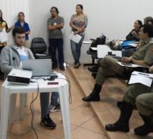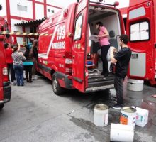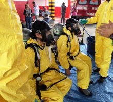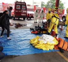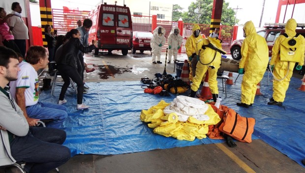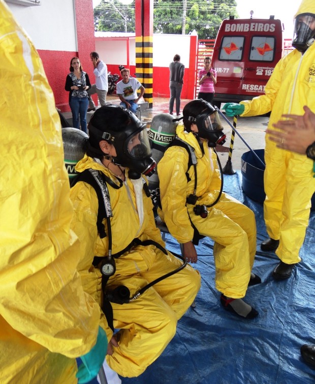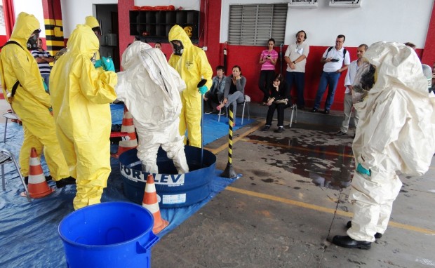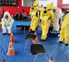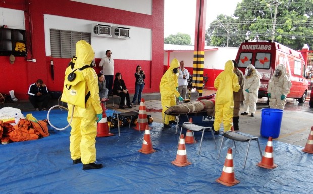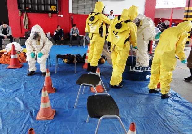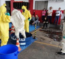Na parte prática, foi realizado Padrão de Atendimento com produto perigoso, como equipagem com níveis de proteção, montagem do corredor de redução de contaminação, reconhecimento de cena, equipagem para atendimento a eventos envolvendo atividades nucleares e o Vírus Ebola. Confira fotos: