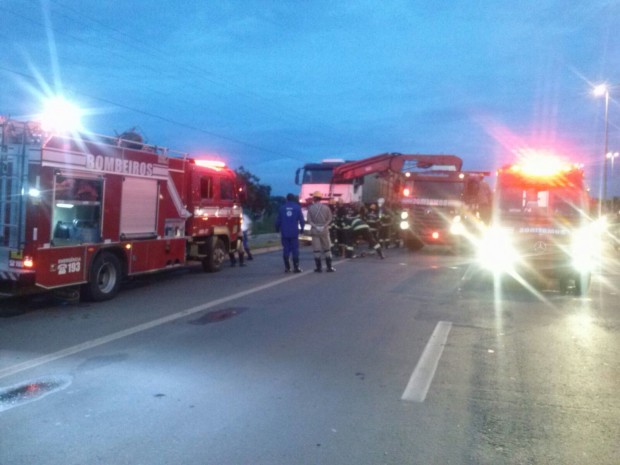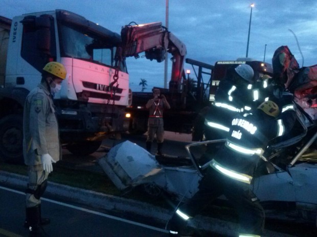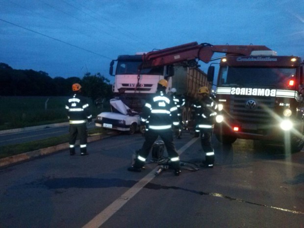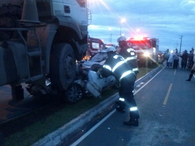 No local, os bombeiros verificaram que o veículo de passeio ficou embaixo do caminhão e que havia duas vítimas presas às ferragens do veículo.