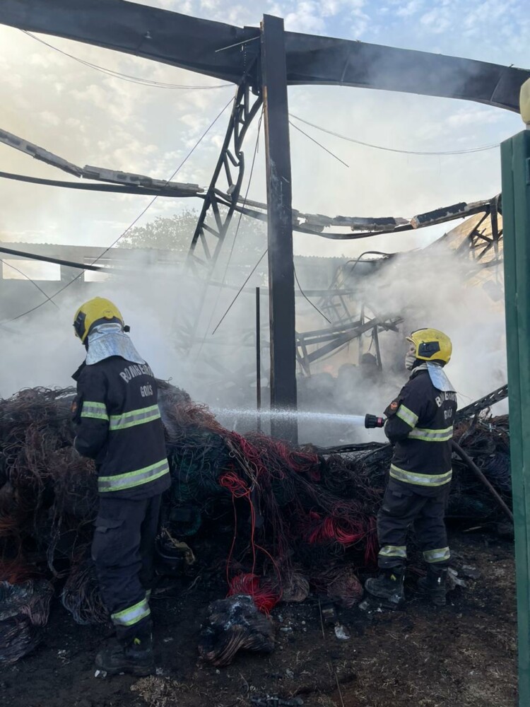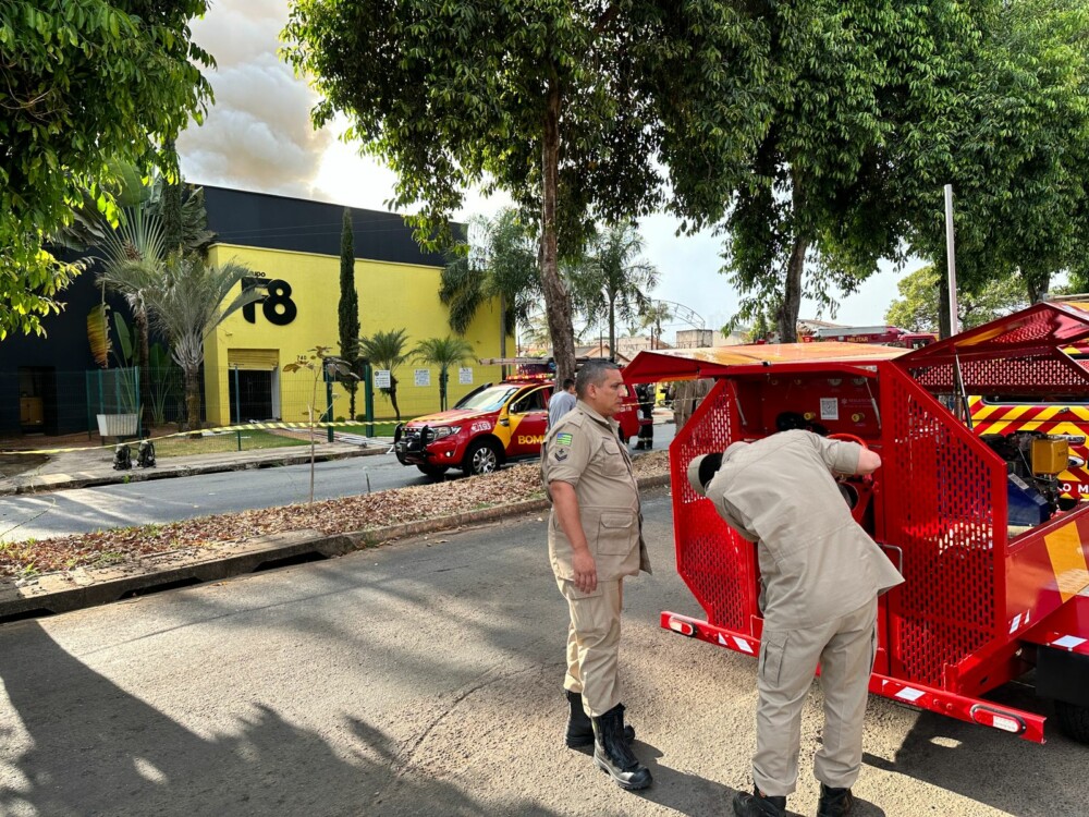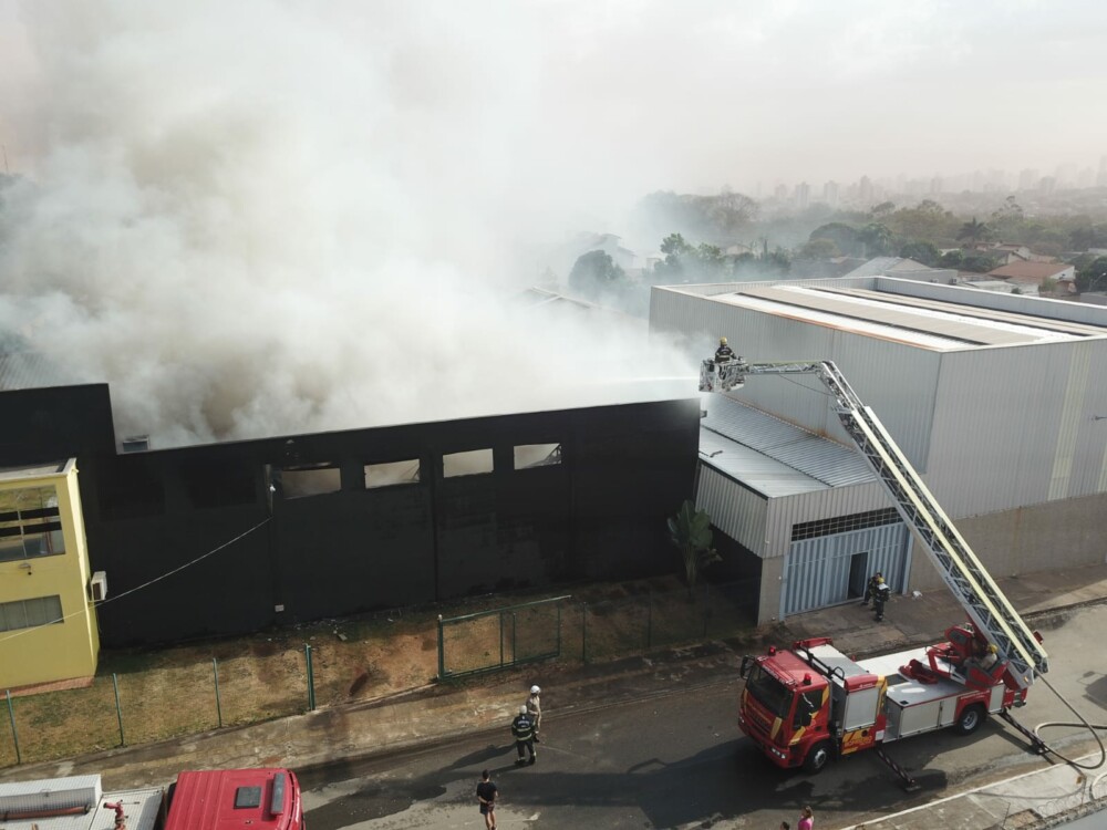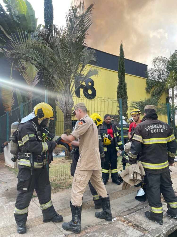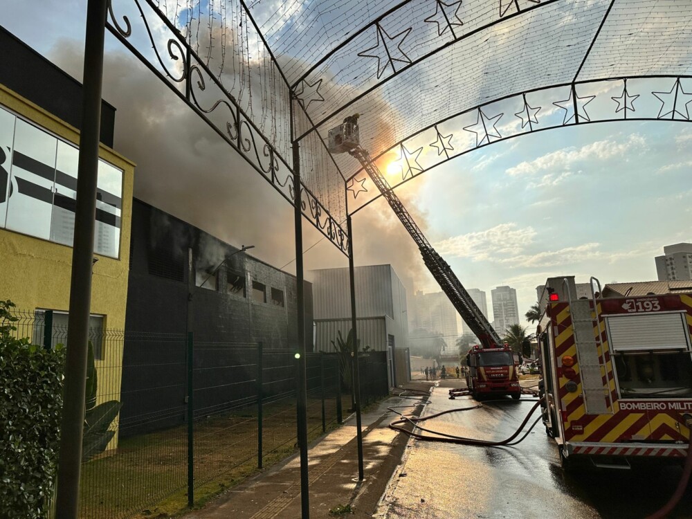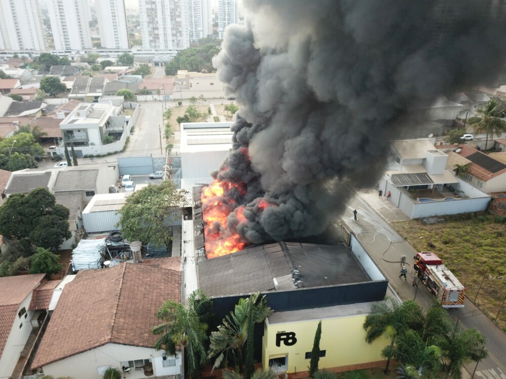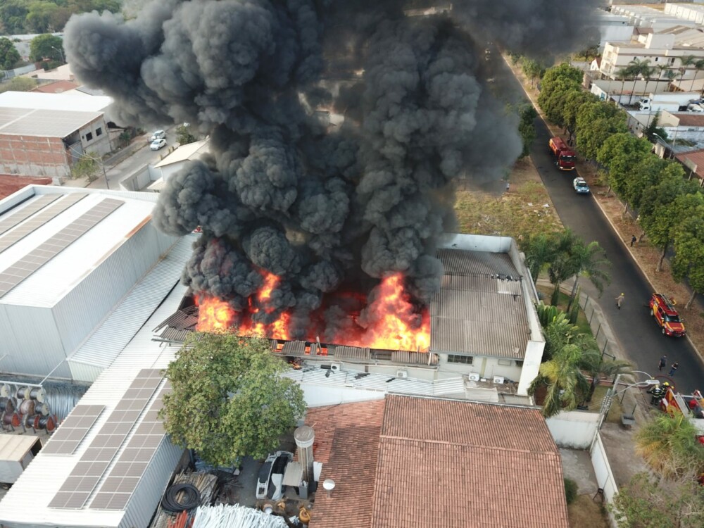 Bombeiros combatem incêndio de grande proporção em galpão em Goiânia