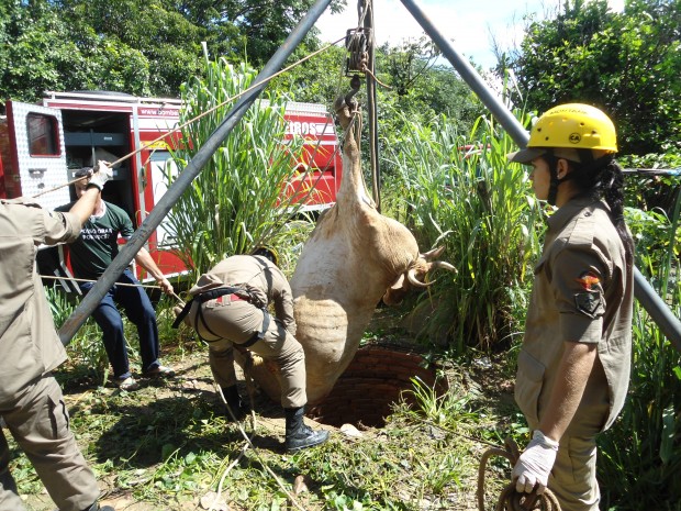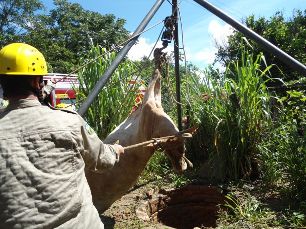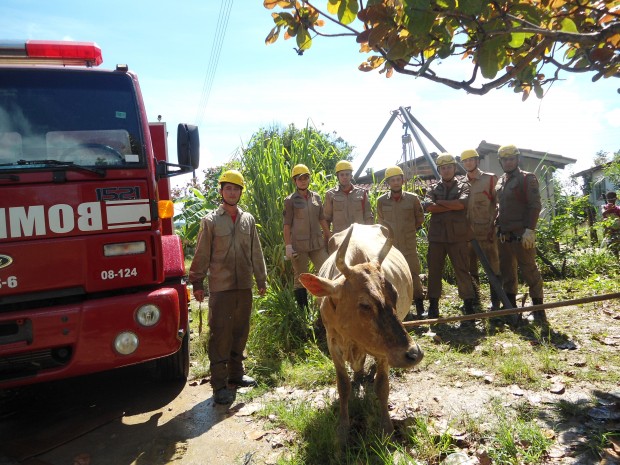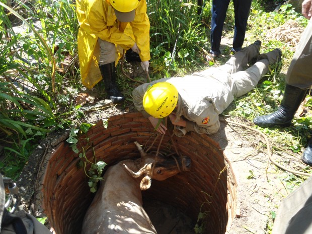 A guarnição de busca e salvamento da 8ª Companhia Independente Bombeiro Militar, na Cidade de Goiás, foi acionada na tarde de quinta-feira, dia 17, para realizar o resgate de uma vaca que havia caído em uma fossa localizada no Setor Papyrus. Ao chegar no local, a guarnição verificou que a vaca estava caída em uma fossa de uma residência abandonada. Com a utilização de tripé e multiplicadores de força, foram realizadas as amarrações necessárias e o  animal retirado com sucesso, sendo entregue ao dono que estava no local. A guarnição era composta pelos Soldados Barros Neto, Maks, Paulo Silveira, Roque, Nascimento e apoiada pelos militares Soldado Caio Dantas e Raicce. Confira fotos: