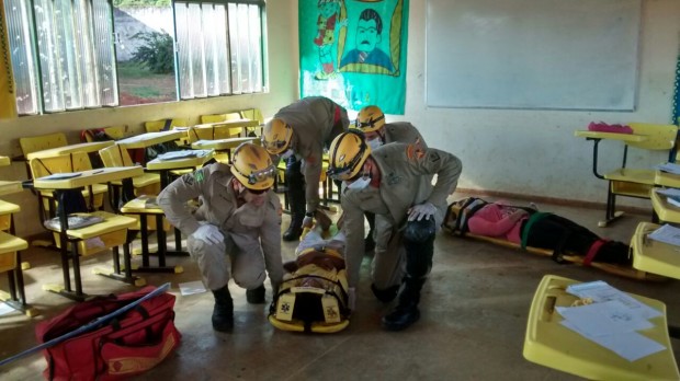A 4ª Companhia Independente Bombeiro Militar, de Águas Lindas, promoveu nesta quarta-feira, 12, um simulado operacional na Escola Municipal João Elísio. A atividade simulou uma situação hipotética de vazamento de GLP seguido de explosão na cantina da escola.