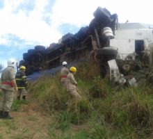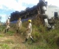 No local, a guarnição de Bombeiros depararam com um caminhão (Volvo) e carreta capotado às margens do viaduto, o condutor com escoriações, foi atendido pela guarnição de resgate. A guarnição de salvamento, efetuou o isolamento da bateria evitando incêndios devido ao vazamento de combustível, o veículo ficou sob a responsabilidade da Policia Rodoviária Estadual. Confira fotos: