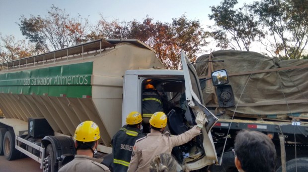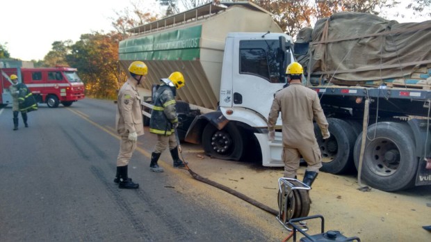 Bombeiros de Jaraguá são acionados para grave colisão entre caminhões na BR-153
