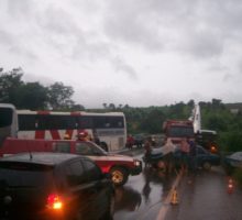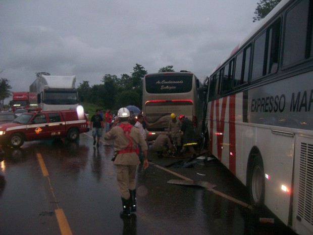 Bombeiros da 17ª Companhia Independente de Bombeiro Militar, em Jaraguá, e do 6º Destacamento Bombeiro Militar, em Ceres, foram acionados na tarde de sábado, dia 12, para socorrer vítimas de um acidente automobilístico, envolvendo dois ônibus de viagem e um carro de passeio, na BR-153, próximo ao município de Rialma. As guarnições de resgate e salvamento, ao chegarem no local, realizaram a retirada do condutor de um dos ônibus que estava preso às ferragens. As vítimas foram transportadas ao Hospital de Urgência de Ceres pelas Guarnições de Resgate do CBMGO, SAMU e ambulância da prefeitura de Rianápolis. Confira fotos: