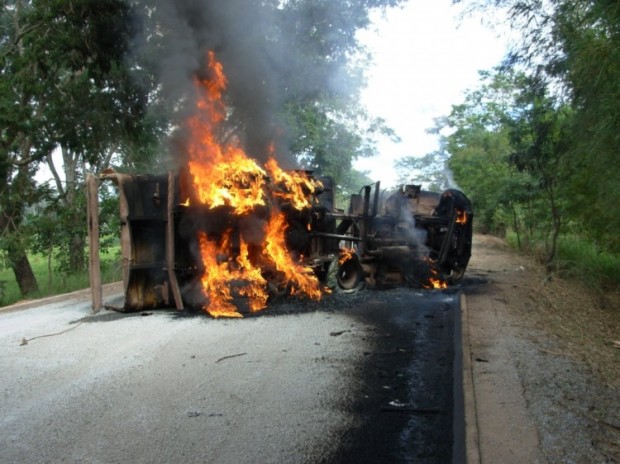 Bombeiros de Luziânia combatem incêndio em caminhão que capotou na GO-010