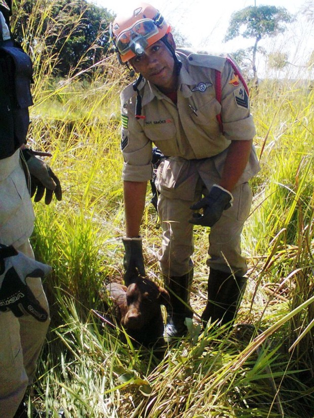 Um cachorro da raça labrador foi resgatado de dentro de uma cratera com cerca de 20 metros de profundidade por Bombeiros do 5º Batalhão Bombeiro Militar, de Luziânia, em Valparaiso de Goiás, na terça-feira, dia 26. Os militares trabalharam em apoio a guarnição de resgate do posto avançado de Valparaiso.  Sete bombeiros participaram da operação de resgate, que durou mais de 30 minutos. Foi utilizado o método de rapel, pois era um local de difícil acesso. Após ser capturado, o animal foi encaminhado à sede do Corpo de Bombeiros de Valparaíso de Goiás.  O animal encontrava-se muito magro e faminto, sendo alimentado pela guarnição de bombeiros e entregue ao centro de zoonoses.  Confira fotos:
