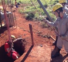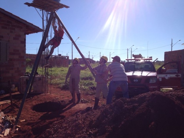 A 15ª Companhia Independente Bombeiro Militar (15ª CIBM), em Palmeiras de Goiás, foi acionada, na manhã de terça-feira, dia 16, para realizar o salvamento de uma vaca. O animal caiu em uma cisterna de aproximadamente 11 metros de profundidade. Para realizar a operação, a guarnição de salvamento da 15ª CIBM montou o tripé, juntamente com o sistema multiplicador de força (roldanas). Uma pá carregadeira também foi utilizada para efetuar a tração do sistema. O animal foi retirado com vida. O Corpo de Bombeiros Militar reforça o alerta para o risco que fossas e cisternas abertas representam para animais e pessoas. Confira as fotos da operação de resgate: