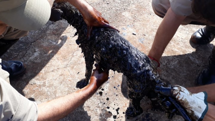 Bombeiros de Senador Canedo resgatam cão que estava preso em poça de piche