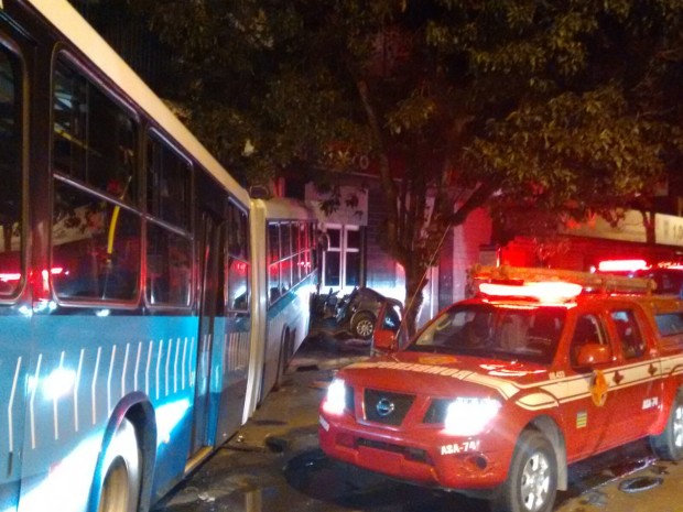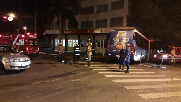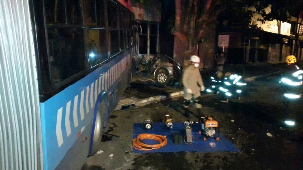 Equipes do 1º Batalhão Bombeiro Militar e do Batalhão de Salvamento e Emergência foram acionadas na madrugada desta terça-feira, 27, para socorrer vítimas de um grave acidente entre um ônibus do Eixo Anhanguera e um carro. A colisão deixou o motorista do carro preso às ferragens. O acidente aconteceu no cruzamento da Avenida Goiás com a Avenida Anhanguera no Centro. Com a força da colisão, os veículos acabaram batendo contra um prédio onde funciona um banco. Parte do ônibus ficou sobre o veículo de passeio. Cerca de oito pessoas estavam no ônibus, mas ninguém ficou gravemente ferido. O motorista do carro, porém, não resistiu aos ferimentos e morreu no local. Seu corpo, que ficou preso às ferragens, foi retirados pelas equipes de busca e salvamento do CBMGO e encaminhado ao IML. Confira fotos da ocorrência:
