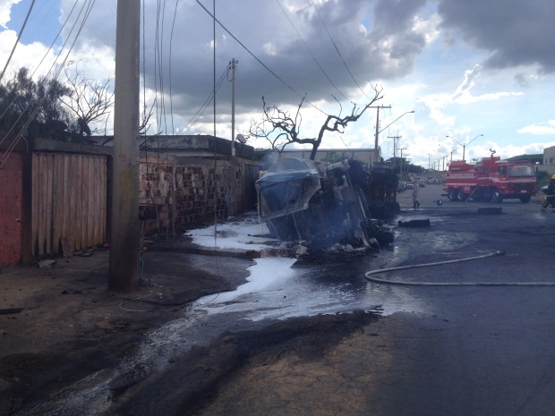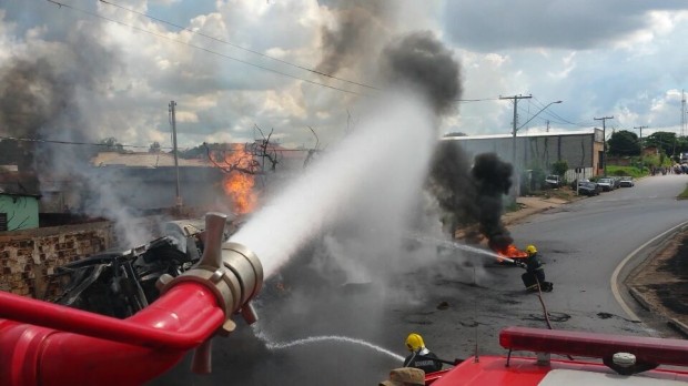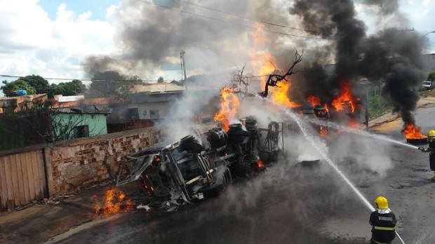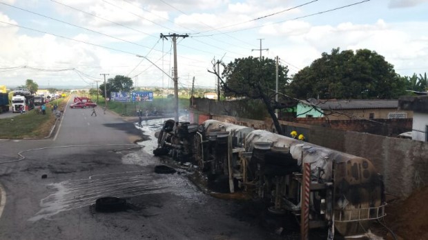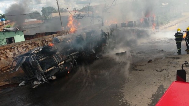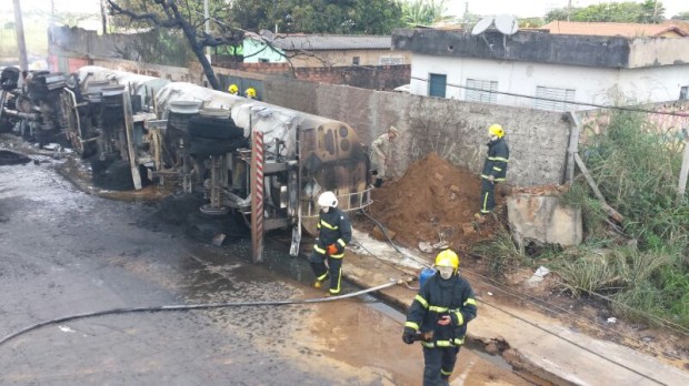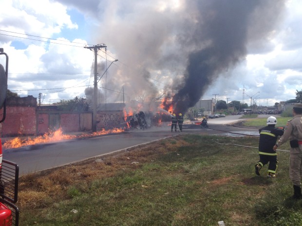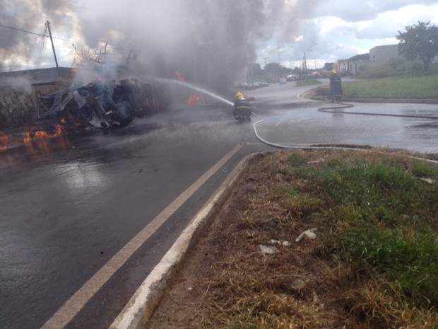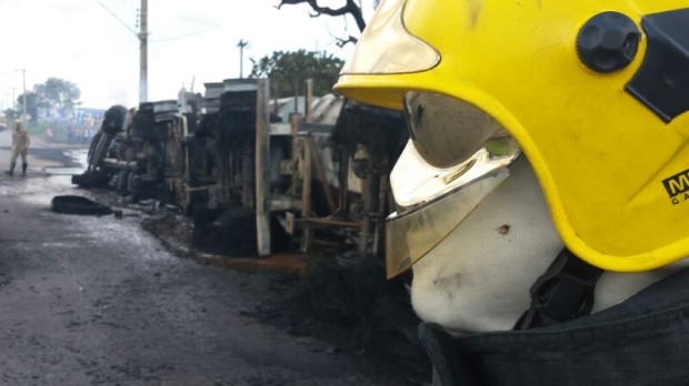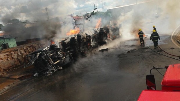 As viaturas de combate à incêndio do Corpo de Bombeiros Militar em Aparecida de Goiânia foram acionadas na tarde de hoje, 1º, para combater incêndio em um Bitrem carregado com 43 mil litros de álcool. Após fazer a curva na rotatória do Anel Viário, na região do Setor Garavelo, a carreta tombou e o incêndio teve início. O motorista do veículo ficou ferido e foi transportado por equipes de resgate.