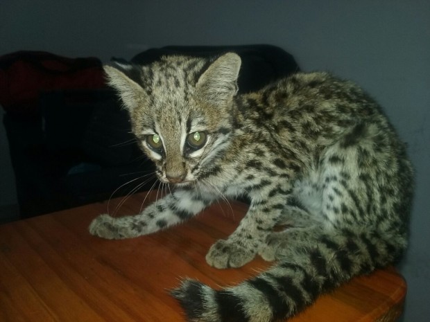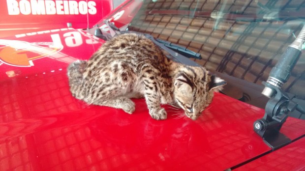 Um filhote de jaguatirica foi resgatado por Bombeiros Militares de Aruanã, na manhã de sábado, 27, em uma casa de ferragens em Mozarlândia, a 298 quilômetros de Goiânia. O animal foi encontrado pelos proprietários do local na noite anterior, ao ser confundido com o gato. Como comportamento era agressivo, perceberam se tratar de um animal silvestre e o mantiveram em um dos cômodos da propriedade até acionarem os bombeiros.