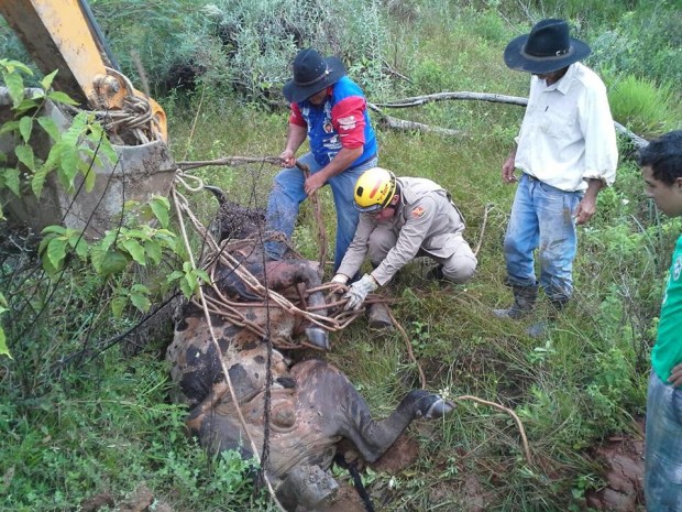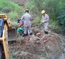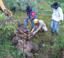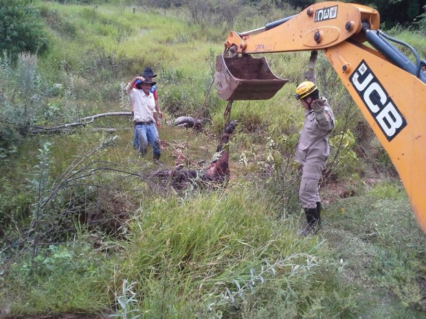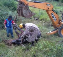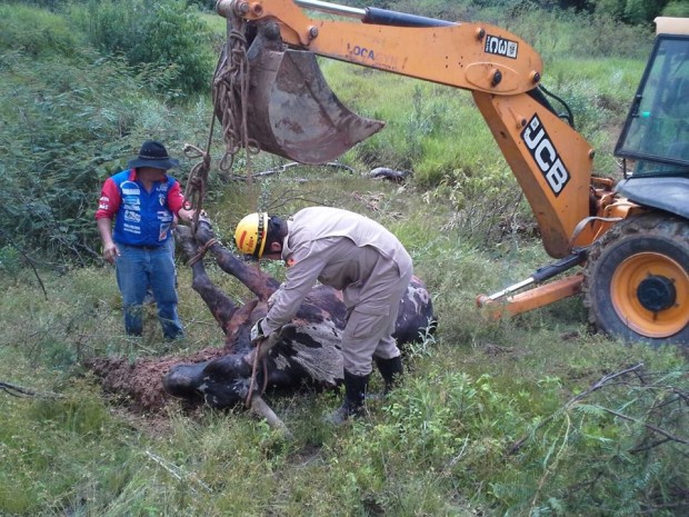 Na terça-feira, 10, a equipe do ABTS-04 do 9º Batalhão Bombeiro Militar – Caldas Novas, composta pelo Subtenente Guilherme e Sargento Dos Santos, foi acionada para atender uma ocorrência de retirada de um boi que estava atolado em um brejo. Com o auxílio de uma retroescavadeira e cordas, a equipe de Bombeiros Militares realizou a retirada do animal.