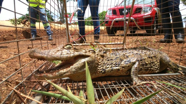 Na quinta-feira, 25, o 10º Batalhão Bombeiro Militar, em Catalão, foi acionado para uma ocorrência de captura de jacaré em uma área de vegetação de uma empresa da região. No local, a equipe de Bombeiros Militares com uso de Equipamento de Proteção Individual e utilizando um gancho de captura realizou a contenção do animal que foi encaminhado para o Centro de Triagem de Animais Silvestres – CETAS. Confira fotos: