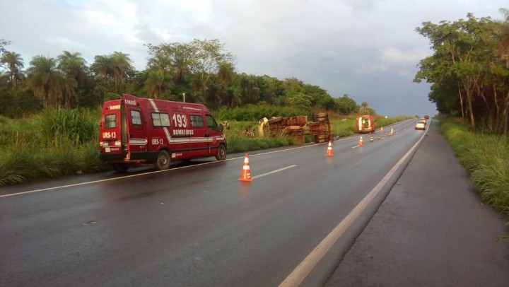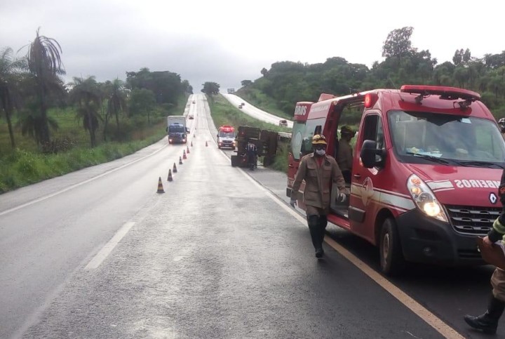O Corpo de Bombeiros Militar do Estado de Goiás, em Formosa, foi acionado na manhã desta segunda-feira, 12, para uma ocorrência de tombamento de um caminhão na BR-020, km 55.