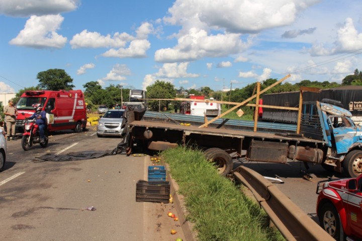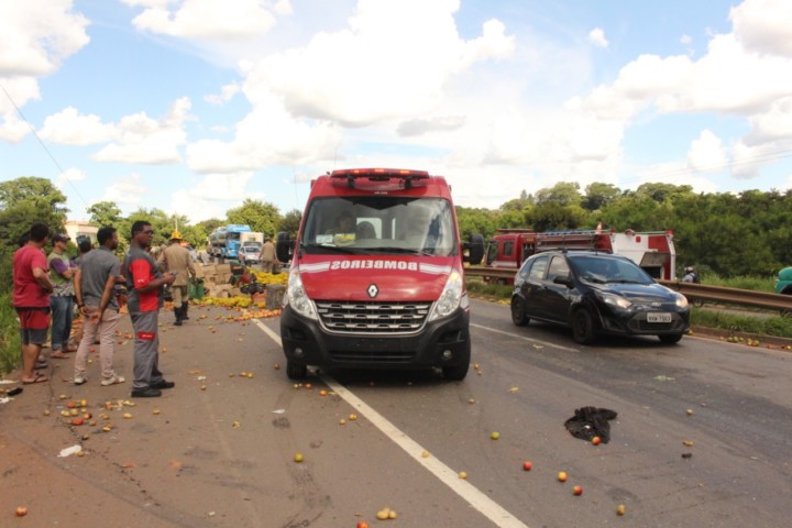 No local, as equipes de Bombeiros Militares verificaram que um caminhão carregado de frutas perdeu o controle do veículo e tombou. O motorista do caminhão, 45 anos, consciente, confuso, com Trauma Crânio Encefálico (TCE) leve. Após atendimento de primeiros socorros, a vítima foi levada pela equipe de bombeiros para o Hospital Estadual de Urgências Governador Otávio Lage de Siqueira (HUGOL). Confira fotos: