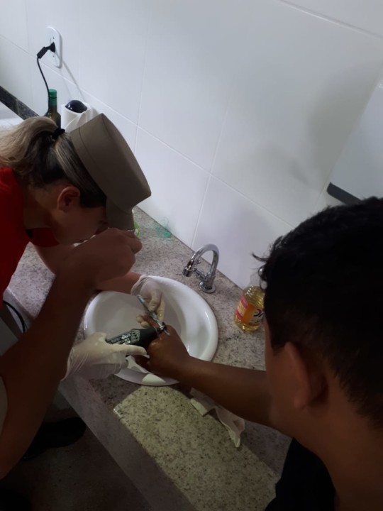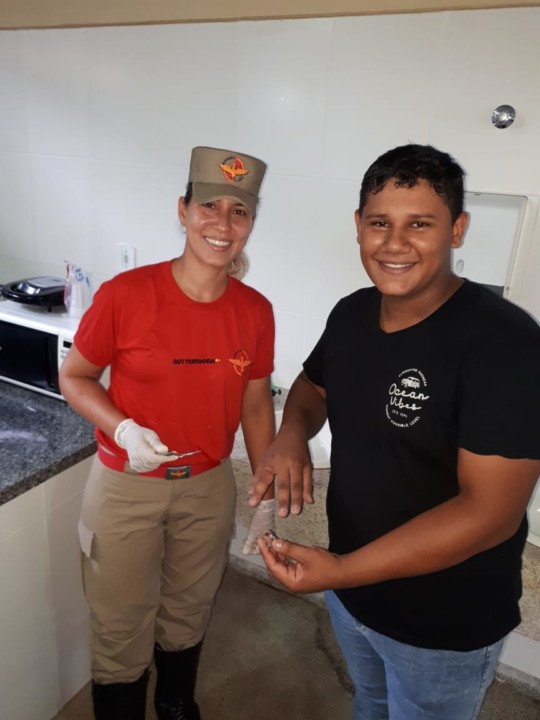 Com o auxílio de equipamento adequado, os bombeiros militares Sargento Fernanda e Soldado Abreu realizaram a remoção do anel com êxito. Confira fotos: