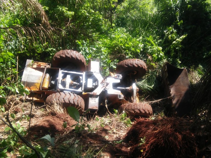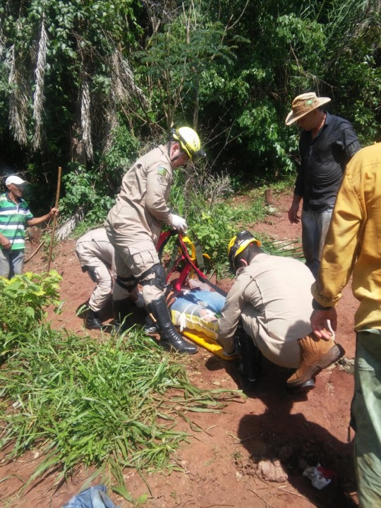 No local, os bombeiros militares verificaram que uma máquina agrícola caiu em uma ribanceira juntamente com seu operador, que ficou com uma das pernas presa e sofreu fratura no tornozelo direito e escoriações diversas.