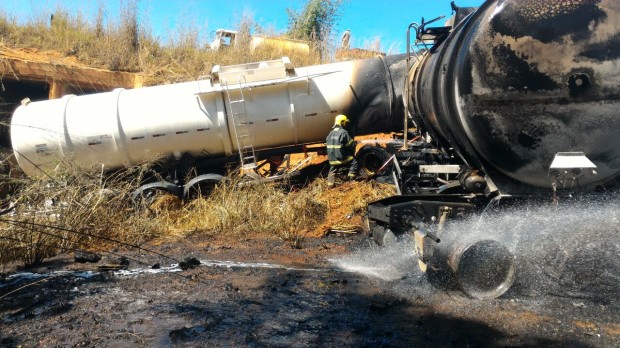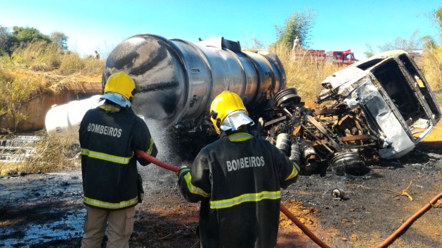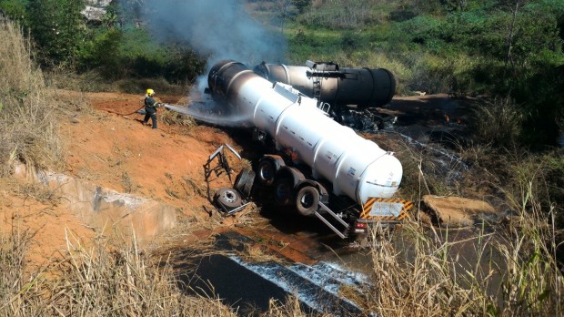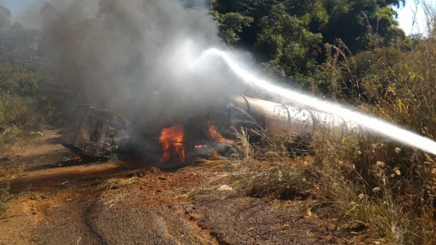 No local, as Equipes de Bombeiros Militares verificaram que o caminhão de líquidos inflamáveis estava tombado às margens do córrego, após uma saída de pista. A guarnição de Combate a Incêndio iniciou rapidamente o combate as chamas do caminhão controlando a propagação do fogo.
