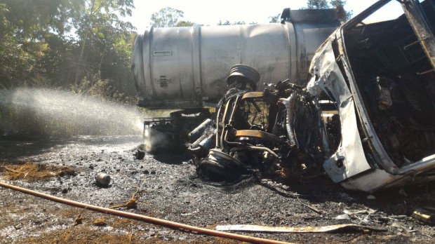 Não houve contaminação do córrego, o veículo estava sem carga e seria carregado com diesel, em Goiânia. Confira fotos:
