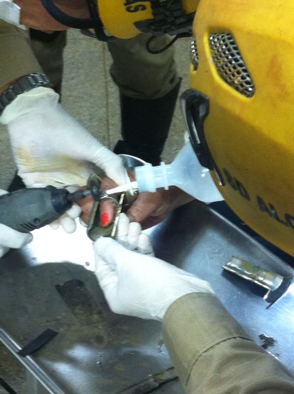 A guarnição de Salvamento do 5º BBM, de Luziânia, foi acionada, na semana passada, para a retirada de um ralo de pia que se encontrava preso ao dedo de uma mulher. Ao realizar a limpeza da pia, o dedo da vítima ficou preso no ralo. A pia precisou ser quebrada e a vítima transportada com o ralo no dedo ao Hospital do Jardim Ingá, onde a equipe composta pelos Cabos Marcelo Freitas e Vargas e Soldado Alcino realizou a retirada do objeto com sucesso e sem ferimentos à vítima.