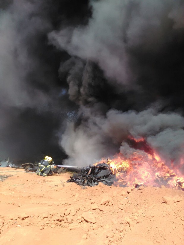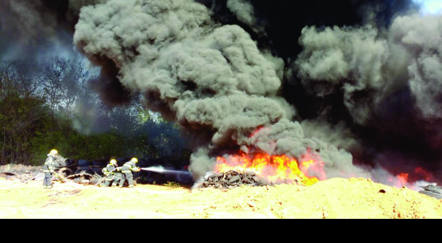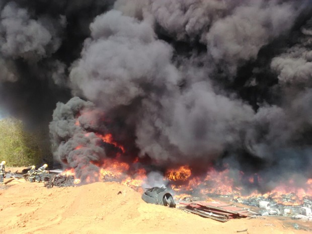 Bombeiros Militares de Morrinhos combatem incêndio em depósito de pneus