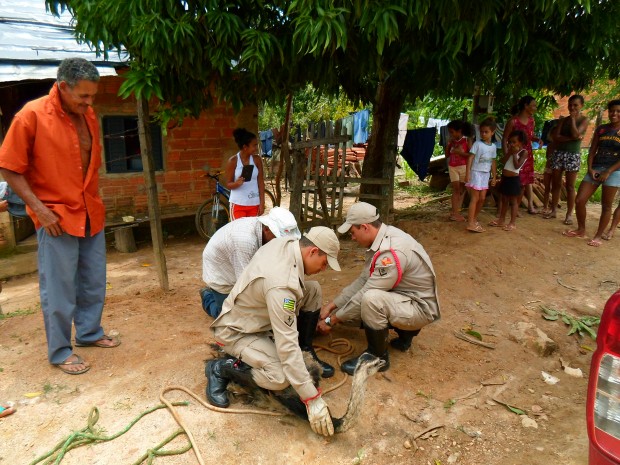 Os moradores de uma casa em Niquelândia, a 330 quilômetros de Goiânia, foram surpreendidos no sábado, dia 15, por uma visita inesperada. Uma ema adulta foi encontrada no quintal da residência. Imediatamente os moradores acionaram o Corpo de Bombeiros pelo telefone de emergência 193.