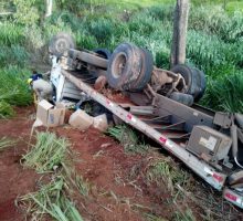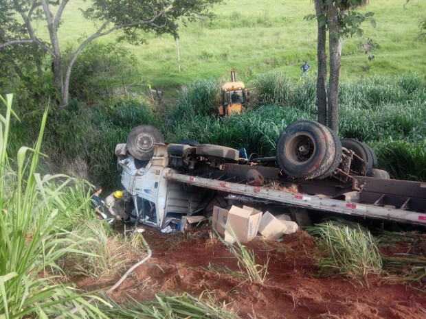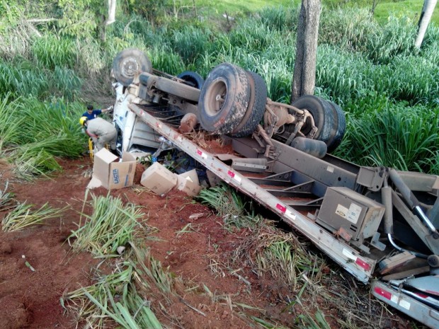 No local, um caminhão carregado de medicamentos saiu da pista e colidiu com uma árvore, deixando o condutor preso por baixo da cabine.