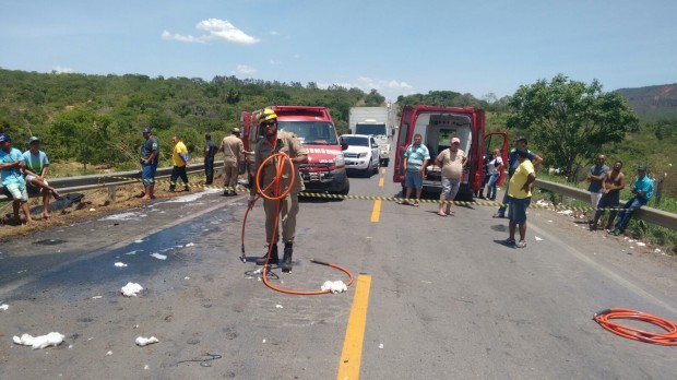 Os bombeiros realizaram ainda a contenção de óleo diesel derramado na pista, utilizando o  Líquido Gerador de Espuma (LGE) . A carga teve  também um princípio de incêndio que foi  rapidamente contido. Atuaram na ocorrência as viaturas  Auto Busca e Salvamento (ABS-10) e  Unidades de Resgate (UR-87, UR-191 e URS-08).