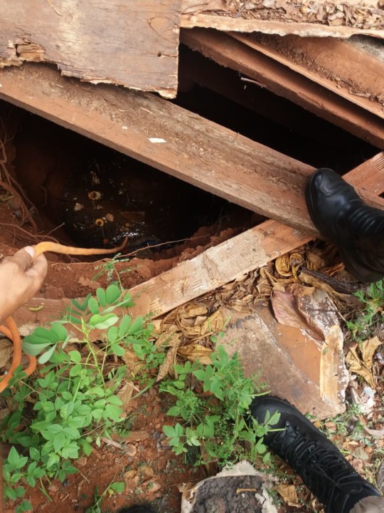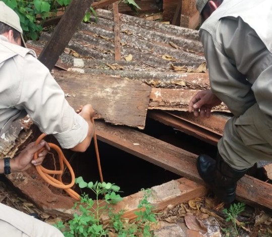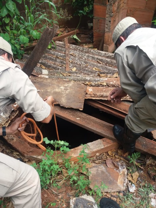 O animal foi encontrado caído dentro da fossa, com aproximadamente 2 metros de profundidade, por moradores que acionaram o Corpo de Bombeiros através do telefone 193.