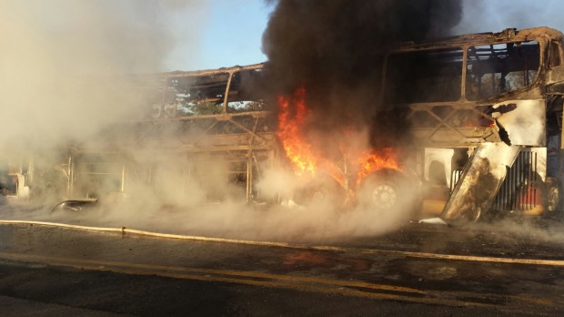 No último domingo, o 1º Pelotão Bombeiro Militar, em São Luís de Montes Belos, foi acionado para atender ocorrência de incêndio em ônibus no Km 146 da GO-060.