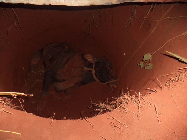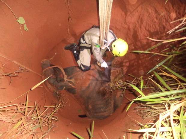 Na segunda-feira, 25, Bombeiros militares de São Luís de Montes Belos foram acionados para atender ocorrência de retirada de uma vaca de fosso no Distrito de Novo Planalto 2, em Firminópolis. O animal caiu em um fosso de aproximadamente 5 metros de profundidade. No local, os bombeiros militares, utilizando técnicas apropriadas, montaram um tripé juntamente com o sistema multiplicador de força (roldanas) e retiraram o animal com vida, sem ferimentos aparentes. O animal foi entregue ao dono. Participaram da ocorrência a equipe da ASA-55, composta pelo Aspirante a Oficial Garcia, 1º Sargento Márcio e Soldado Darlan. Confira fotos: