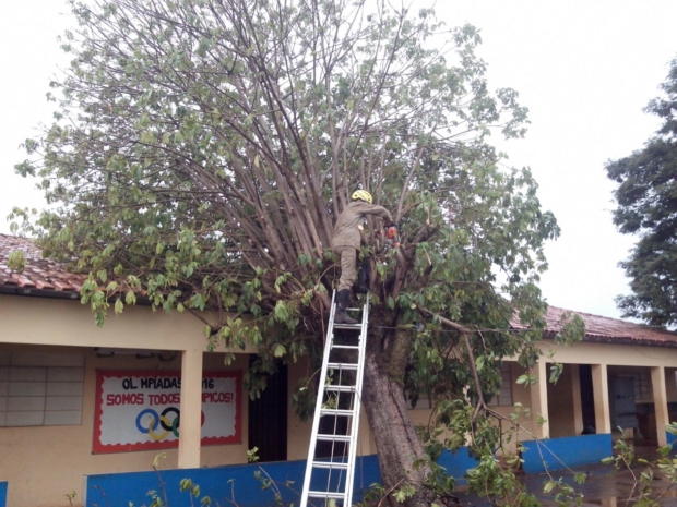 Bombeiros Militares retiram árvore caída em telhado de escola em São Luís de Montes Belos