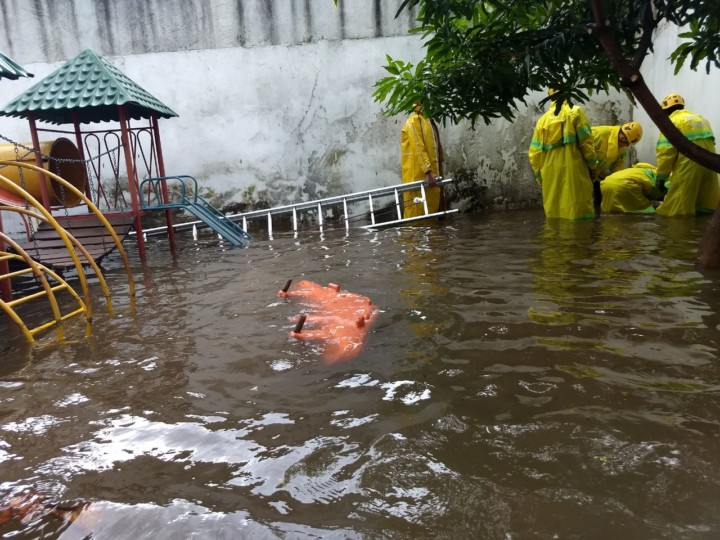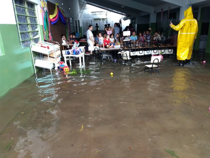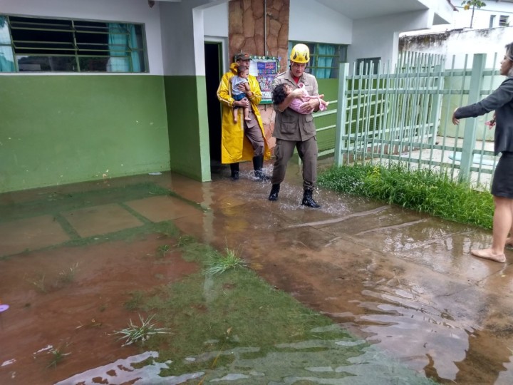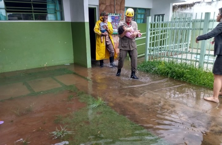 O 8º BBM foi acionado na tarde desta quinta-feira, 5, para atender várias ocorrências causadas pela forte chuva. As guarnições do ABS-38 e ASA-95 socorreram cerca de 90 crianças e também professores que estavam isolados pela água no CMEI Primeiros Passos, localizado na Avenida 84-A, no Setor Sul. O pátio e as salas da edificação ficaram tomados pela água. Os bombeiros militares realizaram o reconhecimento da situação das estruturas circunvizinhas, desligaram a energia elétrica e fizeram duas aberturas no muro para aumentar o escoamento da água. As crianças, com idade de 1 a 5 anos, e os funcionários do CMEI foram retirados da edificação e levados para um local seguro.