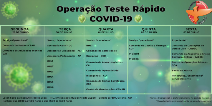 A Coordenação da Operação Teste Rápido – Covid-19 do Corpo de Bombeiros Militar do Estado de Goiás (CBMGO) divulgou o cronograma de testagem para bombeiros militares da região metropolitana de Goiânia. Entre segunda-feira, 29 de junho, e sexta-feira, 3 de julho, os testes estarão sendo realizados na Sede da Instituto Médico Legal – IML, entrada pela Rua Benedito Zupelli – Cidade Jardim, em Goiânia.