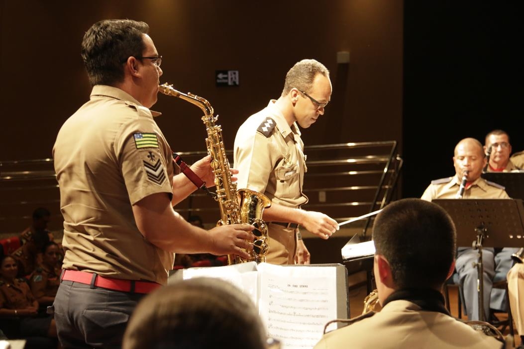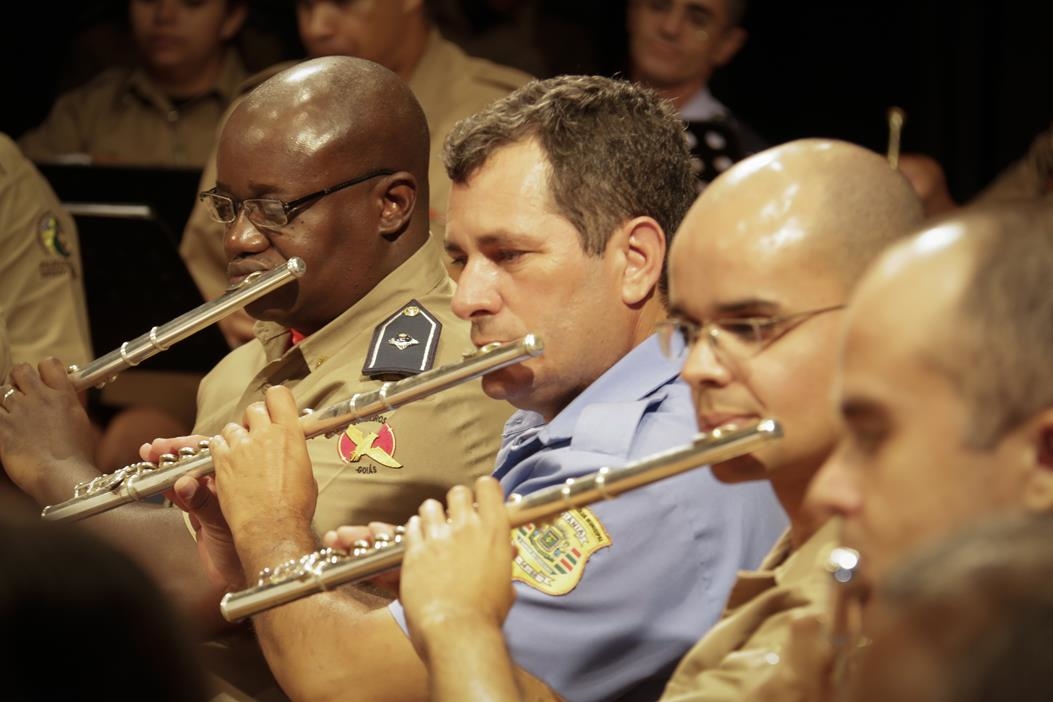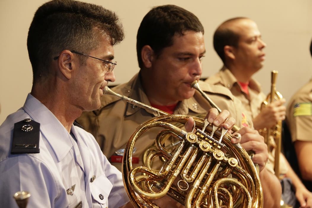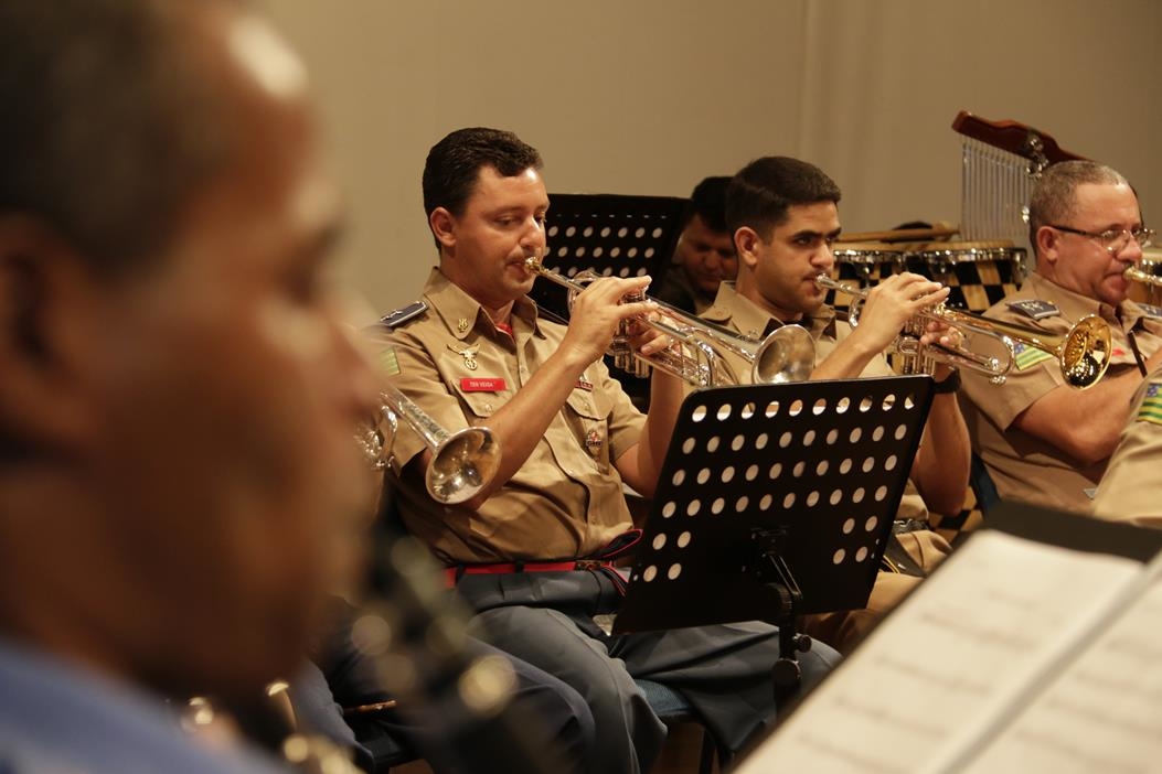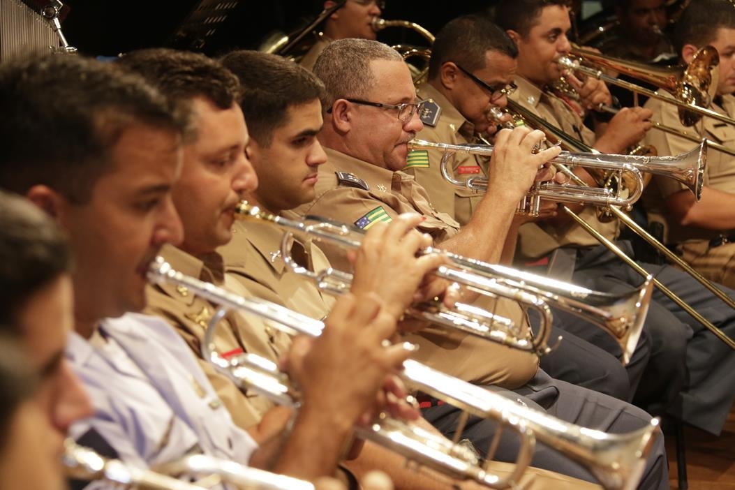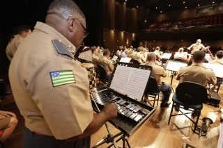 As Bandas Sinfônicas do Corpo de Bombeiros Militar do Estado de Goiás (CBMGO) e da Polícia Militar do Estado de Goiás (PMGO) fizeram uma apresentação conjunta na noite desta quarta-feira, no Teatro Madre Esperança Garrido. O concerto, que teve entrada franca, foi o ponto alto da 3ª Semana do Músico Militar que celebrou o Dia do Músico em Goiás. No palco, cerca de 80 militares músicos emocionaram a plateia com repertório popular de compositores como Frank White, Robert Folk e Sivuca. Integrantes da Guarda Civil Metropolitana de Goiânia (GCM) e da Base Aérea de Anápolis (BAAN), da Força Aérea Nacional, fizeram participação especial na apresentação. O evento foi prestigiado pelo público civil e militar e por autoridades como os Comandantes-Gerais do PMGO, Coronel Divino Alves de Oliveira, e do CBMGO, Coronel Carlos Helbingen Júnior. Parceria entre os militares músicos do CBMGO e da PMGO e realizada pela Secretaria de Segurança Pública e Administração Penitenciária (SSPAP), a 3ª Semana do Músico Militar está promovendo palestras, workshops, competições esportivas, fóruns de debates, entre outras atividades ligadas à área. Confira fotos do concerto: