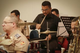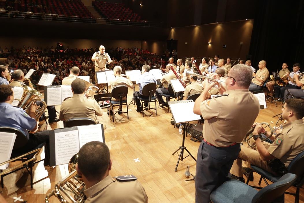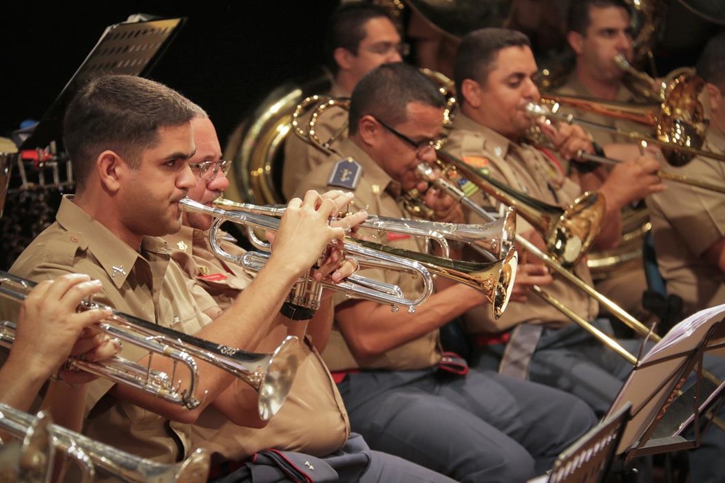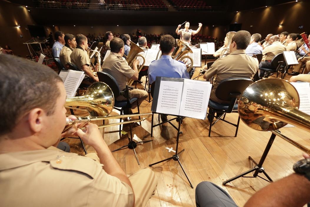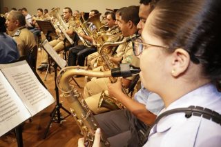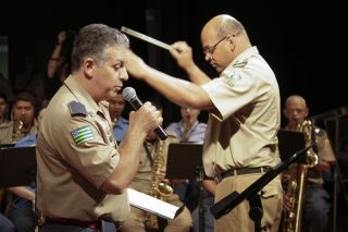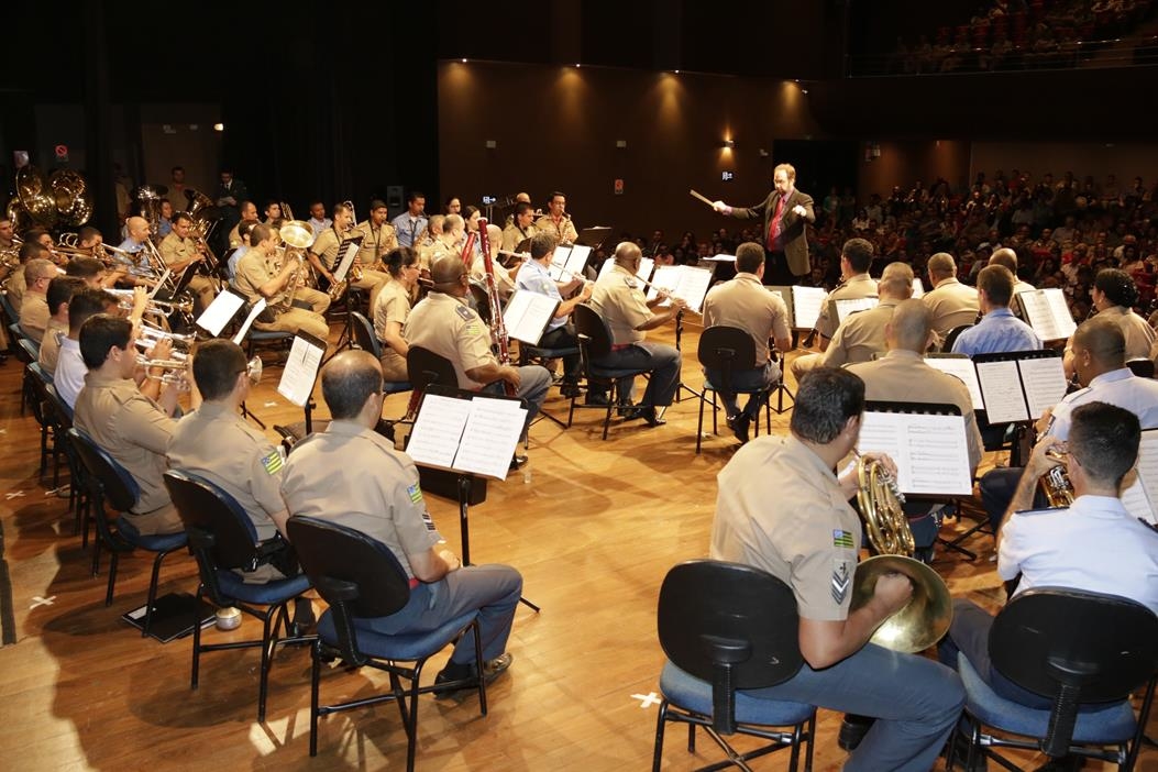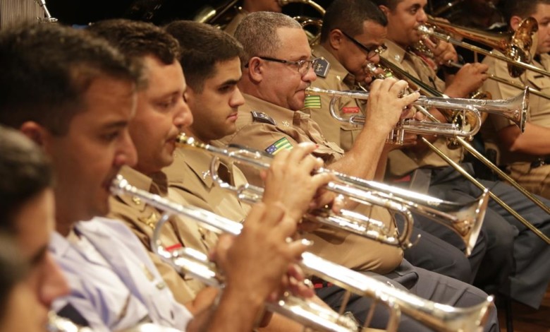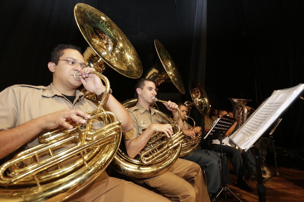 As Bandas Sinfônicas do Corpo de Bombeiros Militar do Estado de Goiás (CBMGO) e da Polícia Militar do Estado de Goiás (PMGO) fizeram uma apresentação conjunta na noite desta quarta-feira, no Teatro Madre Esperança Garrido. O concerto, que teve entrada franca, foi o ponto alto da 3ª Semana do Músico Militar que celebrou o Dia do Músico em Goiás. No palco, cerca de 80 militares músicos emocionaram a plateia com repertório popular de compositores como Frank White, Robert Folk e Sivuca. Integrantes da Guarda Civil Metropolitana de Goiânia (GCM) e da Base Aérea de Anápolis (BAAN), da Força Aérea Nacional, fizeram participação especial na apresentação. O evento foi prestigiado pelo público civil e militar e por autoridades como os Comandantes-Gerais do PMGO, Coronel Divino Alves de Oliveira, e do CBMGO, Coronel Carlos Helbingen Júnior. Parceria entre os militares músicos do CBMGO e da PMGO e realizada pela Secretaria de Segurança Pública e Administração Penitenciária (SSPAP), a 3ª Semana do Músico Militar está promovendo palestras, workshops, competições esportivas, fóruns de debates, entre outras atividades ligadas à área. Confira fotos do concerto: