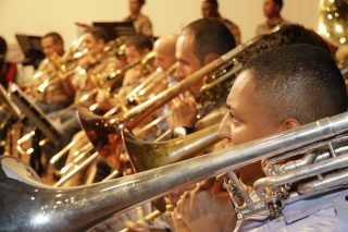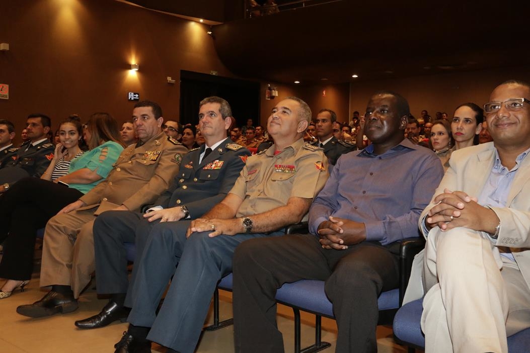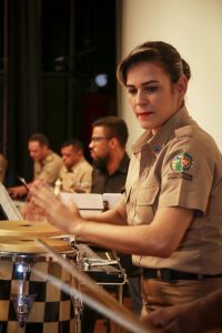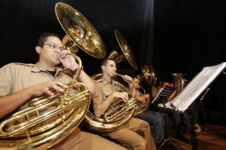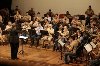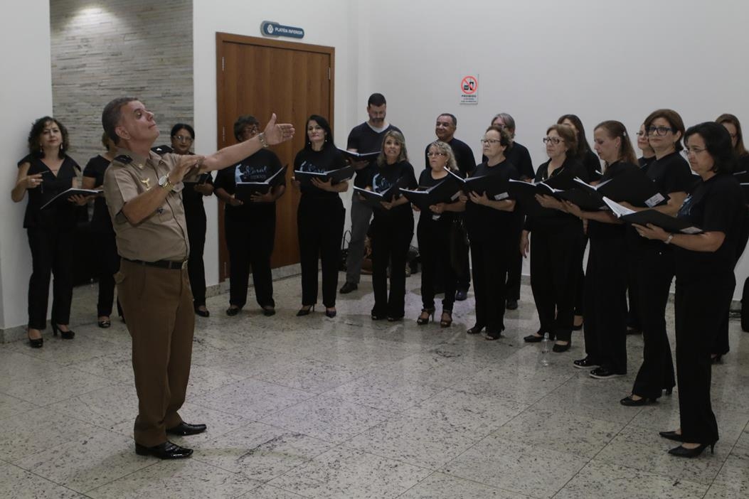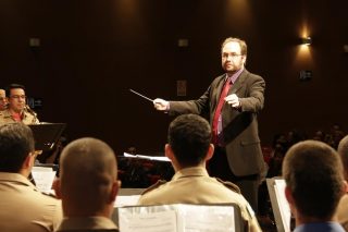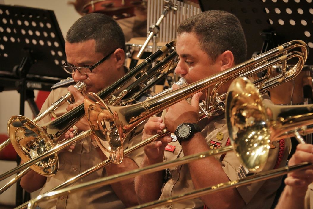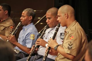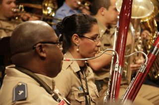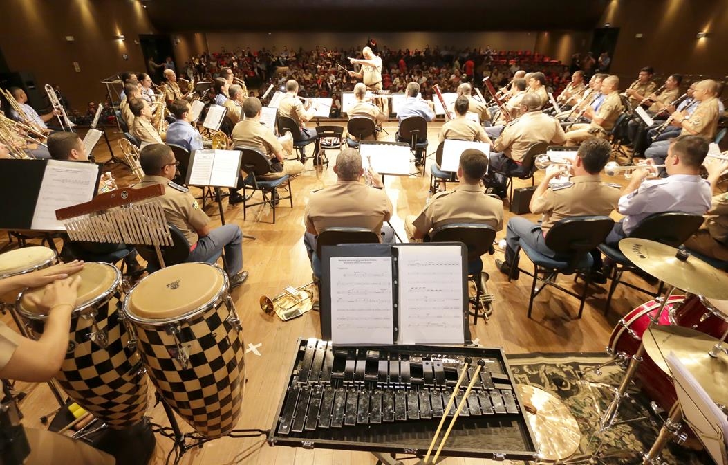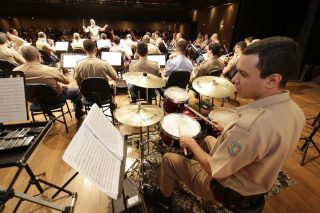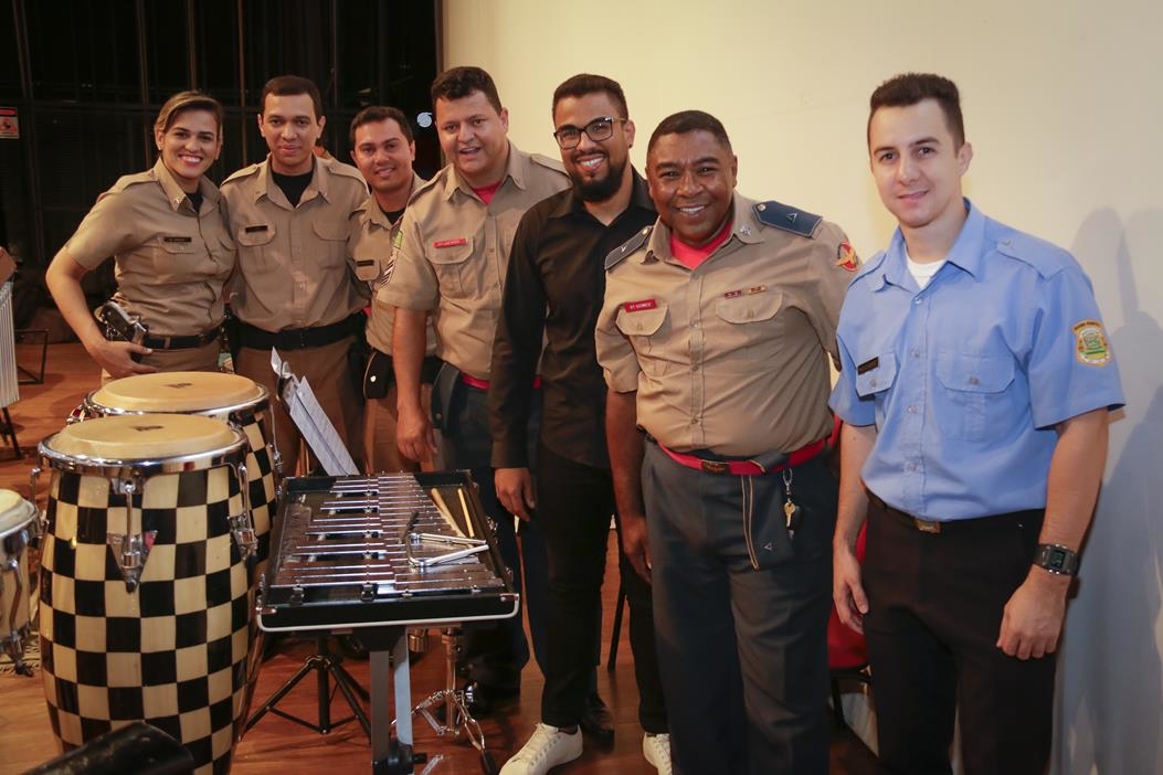 As Bandas Sinfônicas do Corpo de Bombeiros Militar do Estado de Goiás (CBMGO) e da Polícia Militar do Estado de Goiás (PMGO) fizeram uma apresentação conjunta na noite desta quarta-feira, no Teatro Madre Esperança Garrido. O concerto, que teve entrada franca, foi o ponto alto da 3ª Semana do Músico Militar que celebrou o Dia do Músico em Goiás. No palco, cerca de 80 militares músicos emocionaram a plateia com repertório popular de compositores como Frank White, Robert Folk e Sivuca. Integrantes da Guarda Civil Metropolitana de Goiânia (GCM) e da Base Aérea de Anápolis (BAAN), da Força Aérea Nacional, fizeram participação especial na apresentação. O evento foi prestigiado pelo público civil e militar e por autoridades como os Comandantes-Gerais do PMGO, Coronel Divino Alves de Oliveira, e do CBMGO, Coronel Carlos Helbingen Júnior. Parceria entre os militares músicos do CBMGO e da PMGO e realizada pela Secretaria de Segurança Pública e Administração Penitenciária (SSPAP), a 3ª Semana do Músico Militar está promovendo palestras, workshops, competições esportivas, fóruns de debates, entre outras atividades ligadas à área. Confira fotos do concerto: