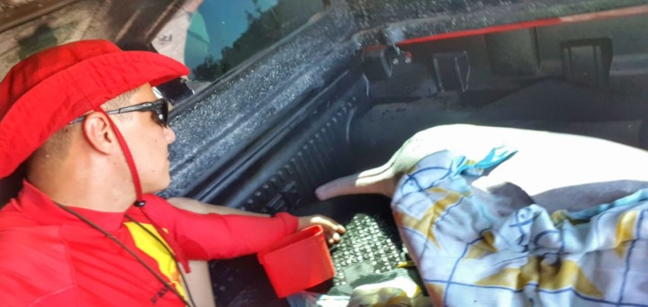 Em seguida, os bombeiros militares improvisaram uma maca com lona, madeiras e corda conduzindo o boto até a viatura. Durante todo o transporte, foram realizados cuidados específicos para manter a hidratação e temperatura corpórea, envolvendo o corpo do animal com panos molhados e monitoramento constante durante todo o trajeto do Ribeirão do Roncador até a cidade de Aruanã (aproximadamente 90 km), onde foi realizada a soltura do boto no Rio Araguaia. Confira fotos: