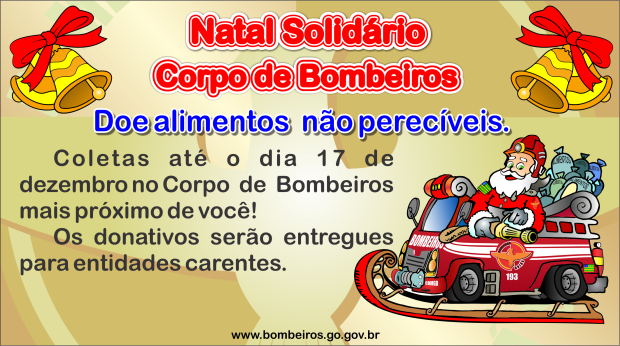 O Corpo de Bombeiros Militar do Estado de Goiás (CBMGO) promove a partir de terça-feira, 2, a campanha ‘Natal Solidário’. O objetivo é arrecadar alimentos não perecíveis para serem doados em entidades filantrópicas do estado.