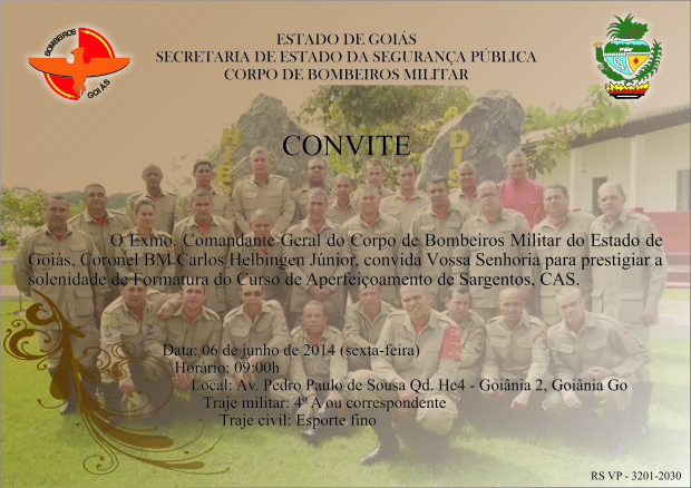 O Corpo de Bombeiros Militar do Estado de Goiás (CBMGO) promove na sexta-feira, dia 6, a solenidade de formatura do Curso de Aperfeiçoamento de Sargentos 1ª turma/2014 . A cerimônia será realizada, às 9 horas, na Academia Bombeiro Militar. Os militares da turma passaram por um curso que os habilitou e os atualizou sobre os conhecimentos profissionais necessário para o desempenho das funções de 2° Sargento Aperfeiçoado, 1° Sargento e de Subtenente. Confira o convite:
