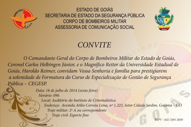 O Corpo de Bombeiros Militar do Estado de Goiás (CBMGO), em parceria com a Universidade Estadual de Goiás, promove nesta sexta-feira, dia 18, a formatura do Curso de Especialização em Gerenciamento de Segurança Pública (CEGESP). A cerimônia será realizada, às 9 horas, no auditório da Polícia Técnico Científica, em Goiânia. O CEGESP tem como objetivo a preparação dos profissionais de segurança pública para o exercício das funções inerentes as suas ascensões na carreira, habilitando-os para as atividades de comando e administração das instituições a que pertencem. Participaram do curso 26 Bombeiros, inclusive de outros estados como Paraíba, Alagoas, Tocantins e Amazonas. Disciplinas como Planejamento Organizacional; Gestão da Qualidade; Gestão de Pessoas; e Gerenciamento de Crises fazem parte do currículo do curso.