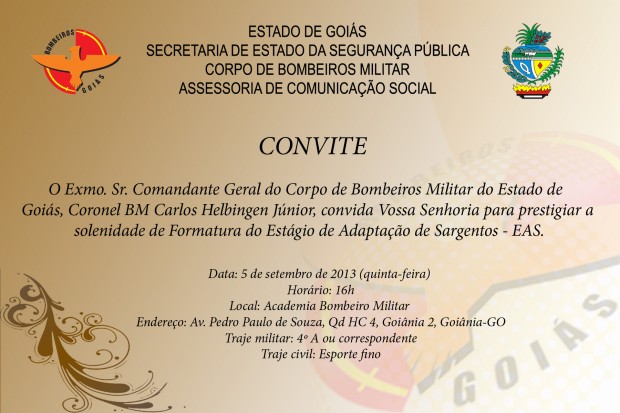 O Corpo de Bombeiros Militar do Estado de Goiás (CBMGO) promove na quinta-feira, dia 5, a formatura do Estágio de Adaptação de Sargentos. A cerimônia, às 16 horas, será no pátio da Academia Bombeiro Militar (ABM), que fica no Goiânia 2. Os 47 militares da turma passaram por um curso que os habilitou para a nova graduação. Durante o EAS, foi proporcionado a eles experiências de aprendizagem de conhecimentos gerais e técnico-profissionais que os capacitaram ao exercício e ao desempenho das atribuições inerentes à nova graduação. Com a conclusão do curso, os 3º Sargentos ficam habilitados para a promoção à gradução de 2º Sargento, conforme a Lei n 15.704, de 20 de junho de 2006. Confira o convite para a solenidade: