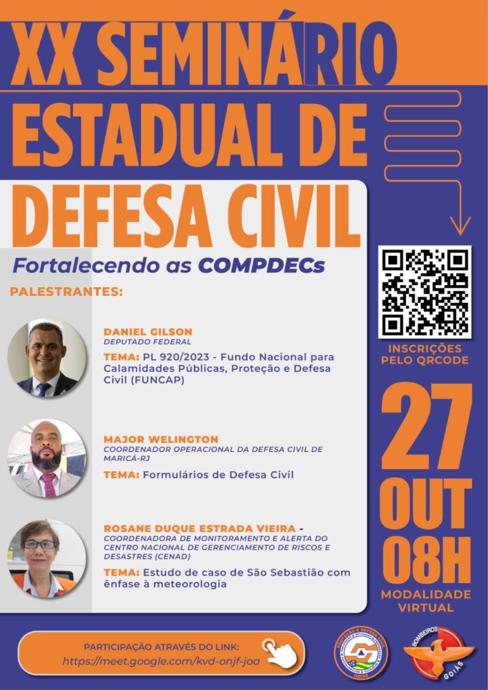 O Corpo de Bombeiros Militar do Estado de Goiás (CBMGO) promove na sexta-feira, 27, às 8 horas, o XX Seminário Estadual de Defesa Civil, evento para a conscientização e preparação em situações de calamidades públicas e desastres. O tema central do seminário é “Fortalecendo as COMPDECs” (Coordenadorias Municipais de Proteção e Defesa Civil). O evento contará com a participação de renomados palestrantes que trarão valiosas contribuições para o aprimoramento das políticas de defesa civil em Goiás.