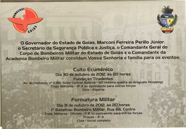 O Corpo de Bombeiros Militar do Estado de Goiás (CBMGO) promove, na próxima quarta-feira, dia 31, às 20h, a solenidade de formatura do Curso de Formação de Oficiais/2012 . O curso, que teve a duração de dois anos, forma trinta e quatro novos oficiais militares para atendimento de qualidade a população de nosso Estado. O evento acontecerá no 1º Batalhão Bombeiro Militar, localizado na rua 66, Centro. Confira o convite: