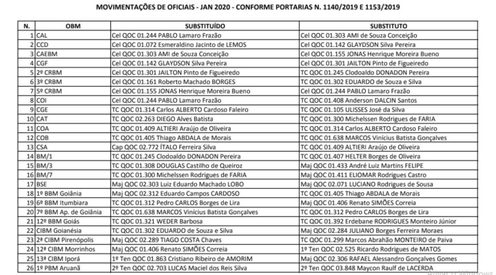 O Corpo de Bombeiros Militar do Estado de Goiás realizou na manhã desta segunda-feira, 13, a cerimônia de Passagem de Comandos e Chefias de Unidades da Corporação. A solenidade, realizada no auditório do Comando Geral, em Goiânia, foi presidida pelo Comandante Geral do CBMGO, Coronel Esmeraldino Jacinto de Lemos. A movimentação de oficiais faz parte do plano estratégico de ações do Comando Geral da Corporação. Em sua fala, Coronel Lemos agradeceu o trabalhos dos militares substituídos e parabenizou os militares que assumem a partir de agora as novas funções. Confira as mudanças promovidas: