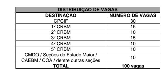 Serão disponibilizadas 100 vagas e são destinadas, preferencialmente, aos bombeiros militares que se encontram ativos no serviço operacional conforme tabela abaixo: