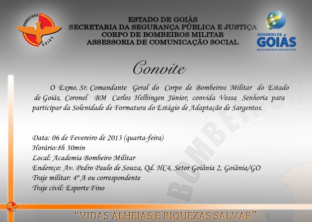 O Corpo de Bombeiros Militar do Estado de Goiás (CBMGO) promove na quarta-feira, dia 6, a formatura do Estágio de Adaptação de Sargentos. A cerimônia, às 8h30, será no pátio da Academia Bombeiro Militar (ABM), que fica no Goiânia 2. Os 47 militares da turma passaram por um curso que os habilitou para a nova graduação. Durante o EAS, foi proporcionado a eles experiências de aprendizagem que os capacitaram ao exercício e ao desempenho das atribuições inerentes à nova graduação. Confira o convite da cerimônia: